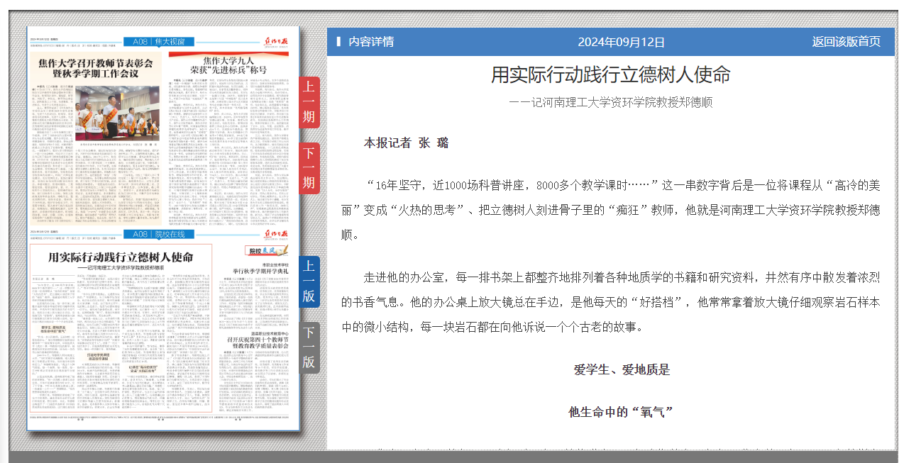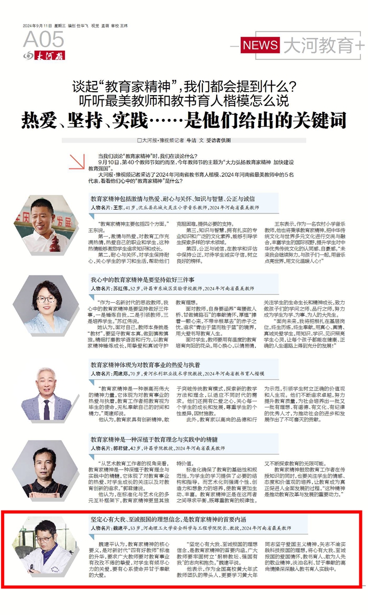 9月10日,《河南日报》《河南工人日报》等主流媒体,聚焦“大力弘扬教育家精神,加快建设教育强国”,宣传报道学校安全学院教授魏建平、资环学院教授郑德顺、数信学院副教授王艳芳先进事迹,他们用实际行动践行“严慈严谨严格”的教风,用无私奉献的育人精神,照亮了莘莘学子的前行之路。相关内容如下: