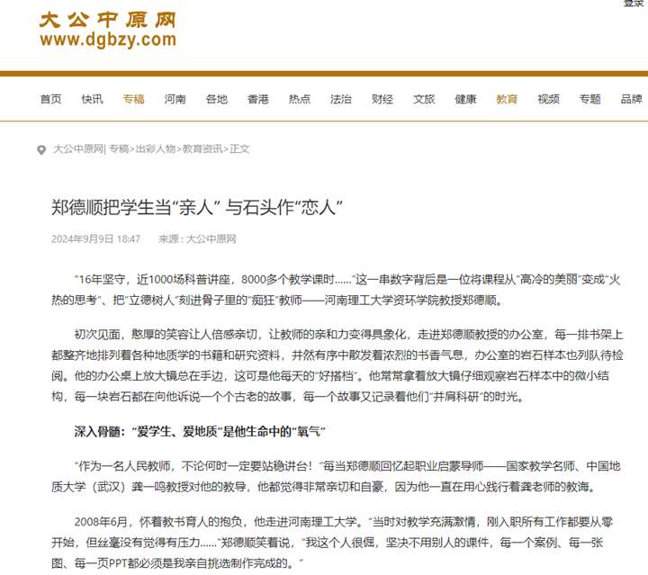 对课程思政的认识和实践,郑德顺能称得上是河南高校中的先行者。早在2016年,他就开始积极探索,有意识地将科学家精神、人文素养等课程思政元素融入《地质学基础》,后来该门课程获批首批河南省高等学校课程思政样板课程、河南省精品在线开放课程、河南省一流课程等。