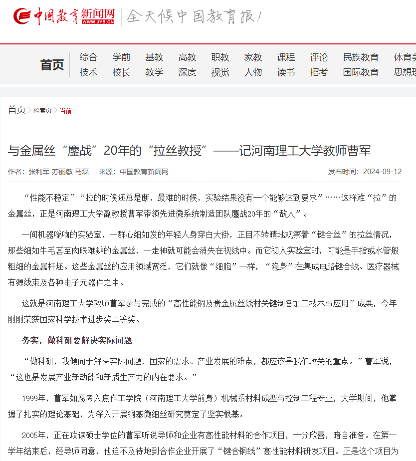 这就是河南理工大学教师曹军参与完成的“高性能铜及贵金属丝线材关键制备加工技术与应用”成果,今年刚刚荣获国家科学技术进步奖二等奖。