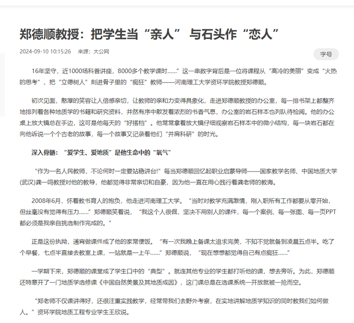 “在我眼里,郑老师就是地质学界一颗璀璨明珠,他的学识与品格令我心生敬仰。他对学生无微不至的关怀和对工作的无私奉献深深感染着我。”郑德顺的博士生李倩倩说,“未来路上,无论遇到什么困难和挑战,我都会以老师为榜样,坚定信念,争取在地质学领域取得更大的成就。”