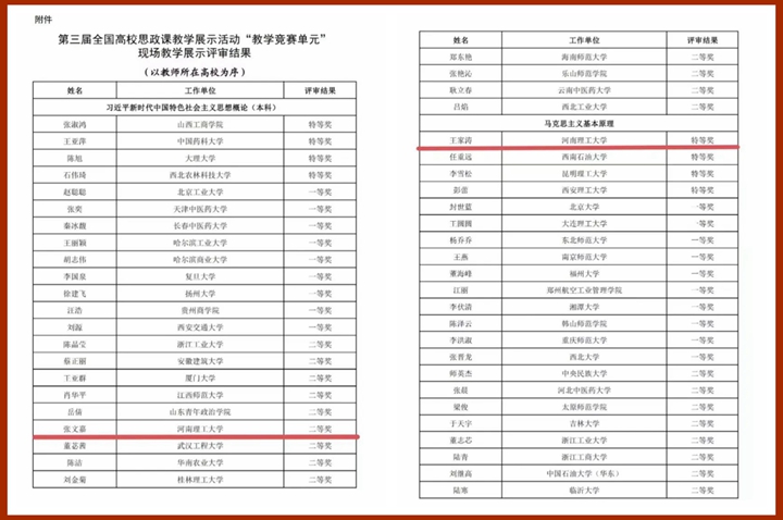 本网讯(通讯员 秦东杰)近日,教育部公布了第三届全国高校思想政治理论课教学展示活动“教学竞赛单元”评审结果,马克思主义学院教师王家涛荣获马克思主义基本原理(本科)组全国特等奖,张文嘉荣获习近平新时代中国特色社会主义思想概论(本科)组全国二等奖,这是继米卫娜2021年荣获第二届全国高校思想政治理论课教学展示暨优秀课程观摩活动二等奖之后,该院教师在全国性赛事取得的又一标志性成果。