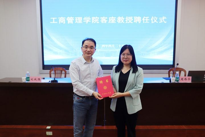 本网讯(通讯员 张子元)4月25日上午,浙江大学教授周伟华受聘为我校工商管理学院客座教授,并作学术报告。工商管理学院院长傅端香出席聘任仪式并为周伟华颁发聘书,工商管理学院领导班子、全体教师和研究生参加报告会。报告会由该院副院长刘战豫主持。