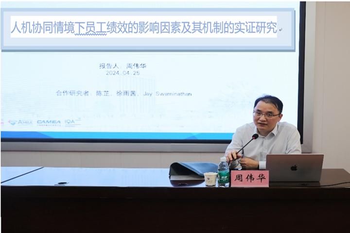 聘任仪式结束后,周伟华作了题为《人机协同情境下员工绩效的影响因素及其机制的实证研究》的学术报告。报告会上,周伟华首先指出当前人机协同(人类与机器/AI协作)已成为一种新的工作模式,其优势在于可以充分发挥人类和机器的独特优势,实现互补和协同,从而提升工作效率和质量。接着,周伟华介绍了自己团队正从事的人机协同研究,该研究以物流快递包裹打包的员工绩效问题为研究对象,揭示了引入打包效率实时排名后,员工的行为会发生什么变化,其工作表现又是如何受到实时排名的影响的。最后,周伟华介绍了开展运营管理与供应链的实证研究的重要性,他指出经典的运营管理研究依赖于数学建模工具和优化方法,未来的运营管理研究应更多地与心理学、经济学等进行互动。整场报告内容丰富、深入浅出,不仅拓宽了师生们的学术视野,也为师生们的科研提供了新的思考角度与研究手段。