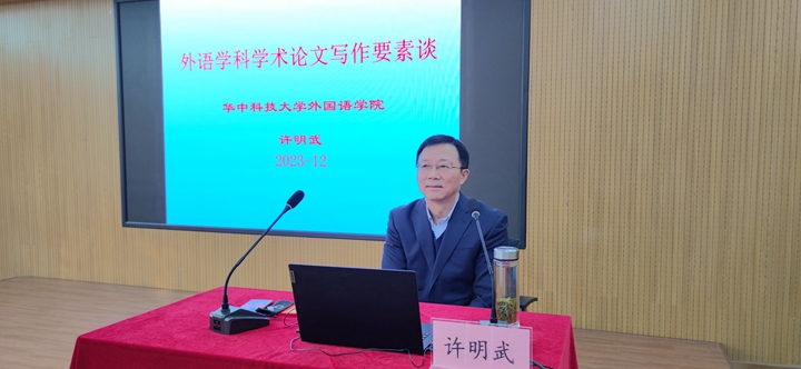 本网讯(通讯员 徐峰 曹旺儒)12月19日下午,应外国语学院之邀,华中科技大学教授、博士生导师许明武在文综楼302室作了题为《外语学科论文写作要素谈》的精彩报告。讲座由该院院长李惠敏主持,全院教师参加了本次讲座。