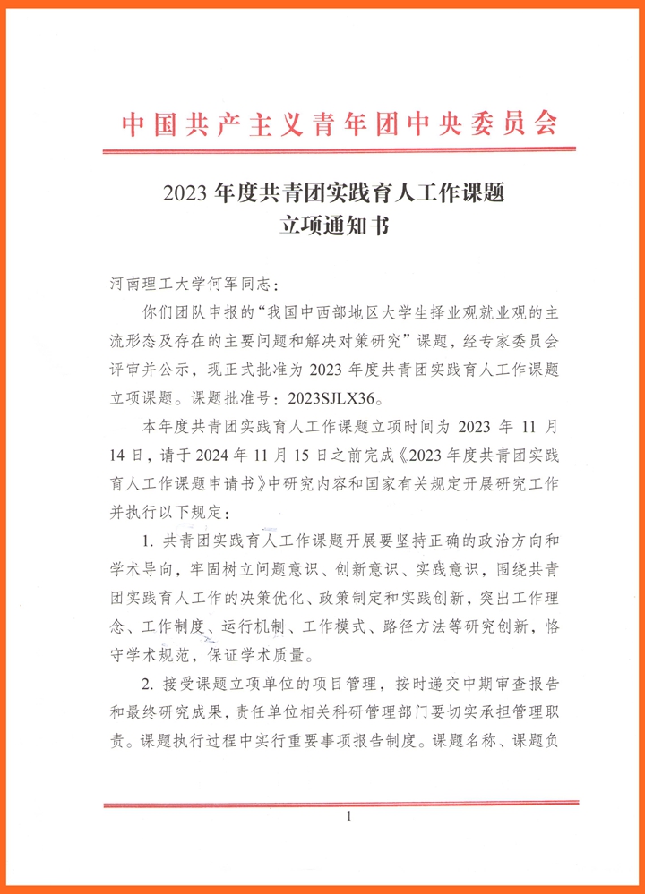 本网讯(通讯员 尹香琰 扬远远)近日,共青团中央青年发展部下发了“2023年度共青团实践育人工作课题”立项通知书,我校外国语学院党委副书记何军主持申报的“我国中西部地区大学生择业观就业观的主流形态及存在的主要问题和解决对策研究”获批“立项课题”。
