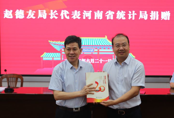 本网讯 (通讯员 贺一凡)6月21日上午,统计讲堂进河南理工大学暨河南省统计局向河南理工大学赠送统计图书仪式在工商管理学院大会议室1105举行。河南省统计局一级巡视员、高级统计师赵德友代表河南省统计局向我校师生捐赠图书资料和数据资料。图书馆馆长海林鹏代表学校接受捐赠。