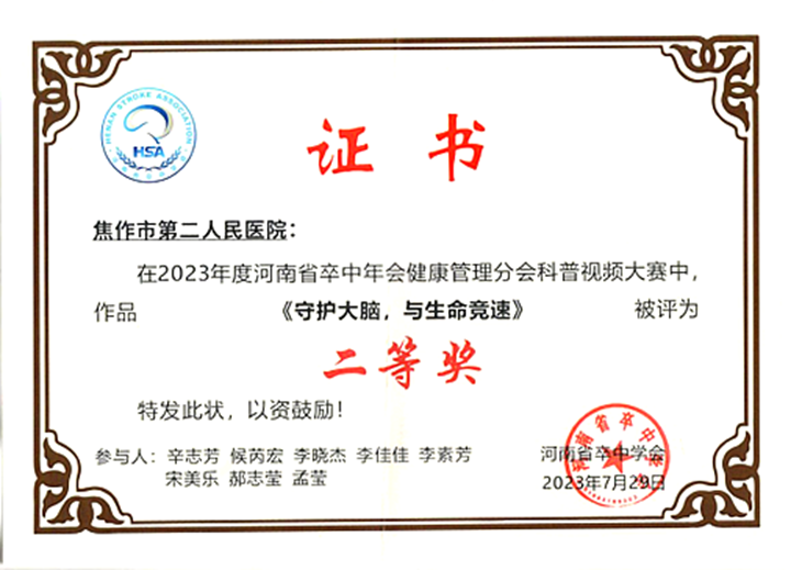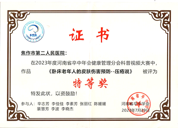 本网讯 (通讯员 闵捷)7月29日,在由河南省卒中学会举办的河南省卒中年会健康管理分会科普视频大赛中,我校第一附属医院(焦作市第二人民医院)神经内科二区护理团队报送的两部健康科普作品《卧床老年人的皮肤伤害预防—压疮说》《守护大脑,与生命竞速》通过层层筛选和激烈角逐,最终脱颖而出,分别荣获特等奖和二等奖。