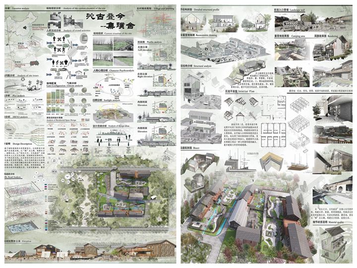 由刘龙、袁凯老师指导,樊泽鑫等三位同学的作品“沁古叠今——集璞舍”获得国赛二等奖,该作品基于韧性视角的乡村更新设计,以武陟县中封村文旅产业发展为例,以“璞”为主题,构建东方院落、寂隐生活。以“花生之乡,文化旅居”为核心,以宅院的形制,构建小亭与院落,顺应当下的生活方式,从衣食住行的生活方式中探寻文化旅居更多的可能性,结合当地民族文化实现韵味提升,在打造新旧融合的过程中保留本土韵味。