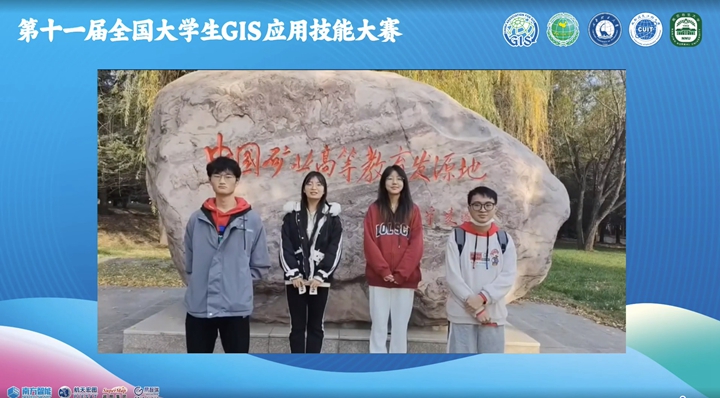 11月18日至20日,由中国地理信息产业协会、中国地理学会主办的“第十一届全国大学生GIS应用技能大赛”在成都理工大学举行,来自全国各地高校180支参赛队伍参加了比赛。我校由测绘学院地理信息科学系主任景海涛教授带队,程结海、王新闯任指导教师,地理信息科学系王佳铱、王婉、王海、罗鸣四位本科生组成的代表队,经过紧张激烈的角逐,最终获得了全国一等奖的优异成绩。