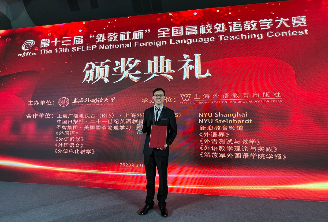 2022年,余阳老师经过学校和河南省的层层选拔和比赛,历经省内外专家评审等诸多环节筛选后,取得了第“十三届”全国高校外语教学大赛(大学英语组)河南省赛区特等奖第一名的好成绩,取得全国决赛资格。决赛分为线上随机抽取试题、线下陈述整体教学设计并进行教学展示、回答评委提问四个环节。来自全国30个省赛区的30名特等奖获得者参加了决赛,前10名选手晋级全国总决赛。经过紧张激烈的角逐,余阳顺利晋级全国总决赛。总决赛竞争更加激烈,选手赛前30分钟拿到讲课材料,在封闭环境中准备授课、制作PPT和答辩。最终余阳凭借独具匠心的教学设计、扎实的教学基本功、良好的教学仪态、丰富的知识和极佳的临场应变,获得现场评审专家和师生的一致好评,取得了全国大学英语综合组二等奖,全国总排名第六的优异成绩。