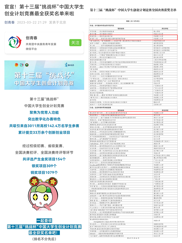 本届“挑战杯”中国大学生创业计划竞赛聚焦创新、协调、绿色、开放、共享五大发展理念和乡村振兴战略,设置科技创新和未来产业、乡村振兴和农业农村现代化、社会治理和公共服务、生态环保和可持续发展、文化创意和区域合作等五个组别,涵盖农林、畜牧、食品及相关产业、生物医药、化工技术、环境科学、电子信息、材料类、机械能源、工艺与设计、服务资讯等领域,共吸引来自3011所高校142.4万名学生参赛,累计提交33万余个创新创业项目。经过校级初赛、省级复赛、全国决赛初评、全国决赛终评等环节共评选产生1542个获奖项目。由电气学院推荐,刘群坡、王瑞、杜少通、王立国、艾立旺老师指导的乡村振兴和农业农村现代化类作品《智渔科技—智能化渔业践行者》,由物电学院推荐,李亚、霍静娟老师指导的乡村振兴和农业农村现代化类作品《请“菌”入翁——智能化食用菌大棚种植管理开拓者》,由化工学院推荐,李望、朱晓波老师指导的生态环保和可持续发展类作品《微生物化“碱”为常—铝工业废渣资源化利用开拓者》3个作品获得国家铜奖。此外,在2022年“挑战杯”河南省大学生创业计划竞赛中,我校42件作品获得省级奖项,其中荣获特等奖3项,金奖7项,银奖9项,铜奖23项,33名指导教师获省级优秀指导教师荣誉称号,学校获得“优胜杯”荣誉称号,获奖作品数量创新高。