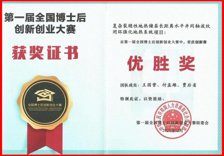 本网讯 (通讯员 李敏)河南省第一届全国博士后创新创业大赛表彰暨推进博士后工作高质量发展会议6月30号在省人社厅成功召开,会议表彰了我省在第一届全国博士后创新创业大赛的获奖团队。我校博士后王国营申报的项目《复杂裂隙性地热储层长距离水平井同轴波纹闭环强化地热系统》荣获第一届全国博士后创新创业大赛创新赛全国优胜奖。