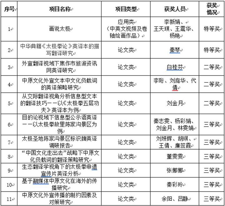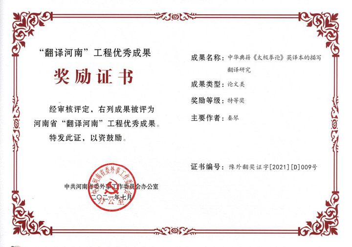 本网讯(通讯员 王天琪)近日,河南省委外事工作委员会办公室发布《中共河南省委外事工作委员会办公室关于2021年度“翻译河南”工程优秀成果征集情况的通报》(豫外委办〔2021〕33 号),我校有11件作品获奖,其中特等奖2项,二等奖3项,三等奖6项。特等奖为省级奖,一、二、三等奖为厅级奖。本次活动是省委外事工作委员会办公室在全省开展的翻译优秀成果评选活动,旨在征集和评选具有前瞻性、创新性和应用价值的“翻译河南”成果,弘扬黄河文明、中原文化,讲好河南故事,进一步加强我省在国际语言能力与国际传播能力等领域的学理研究和成果转化应用,加快构建对外话语体系,服务我省高水平开放和高质量发展的任务要求。