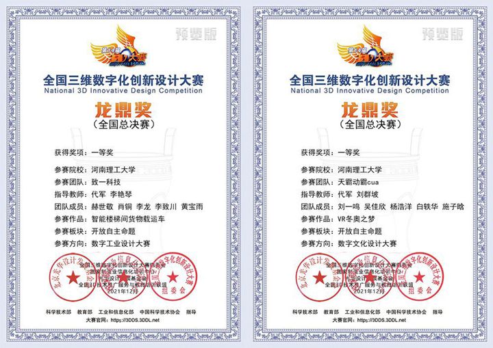 本网讯(通讯员 代军)日前,第十四届全国三维数字化创新设计大赛(简称“全国 3D 大赛”)年度总决赛颁奖盛典顺利闭幕。结合当前疫情防控形势,比赛采用了线上为主的方式进行,共设置27个赛场,邀请近100位行业/院校/企业专家参与了国赛作品的评审工作,评审主要考察设计创新性、工程实用性、美学、商业可开发价值、社会价值等多项因素,本着公平、公正、公开的原则完成了作品评审工作。我校6项作品入围全国总决赛,最终获得一等奖2项,二等奖3项,三等奖1项,学校获得优秀组织奖,充分展示了河南理工学子的风采。