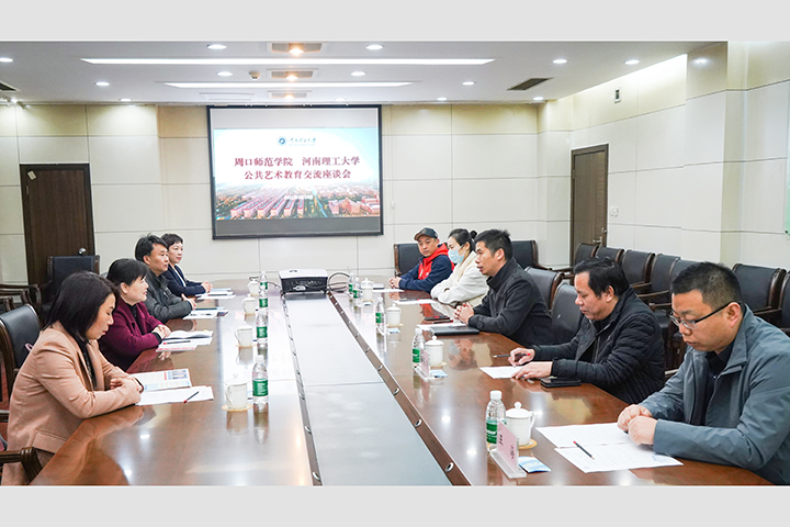 公共艺术教育委员会委员、建艺学院院长王同文对周口师范学院公共艺术与职业技能教研部付静一行的到来表示欢迎。会上,王同文就学校公共艺术教育中心创办历史、开课情况,学生活动等方面进行了介绍,并对周口师范学院公共艺术教育的发展成果表示肯定。双方就公共艺术教育机构设置、教学管理、课程建设、大学生艺术展演、指导学生工作量、公共艺术教育评估等方面充分交流了意见。公共艺术教师王维天、王海分享了我校公共艺术在省级精品在线开放课程和省级一流本科课程建设等方面的经验与成果。