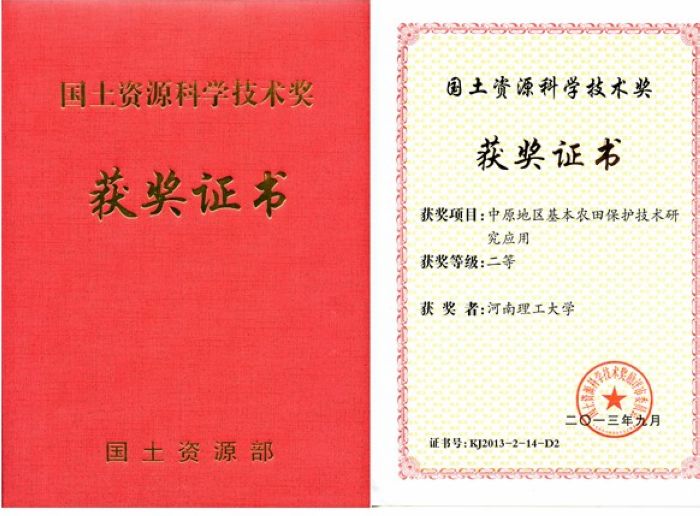 近日,从国土资源部传来喜讯,由河南理工大学与河南省国土资源调查规划院、河南农业大学、河南大学、河南省城市规划设计研究总院有限公司等单位共同完成的国家十一五科技支撑计划课题“中原地区基本农田保护技术研究应用”荣获2013年度国土资源科学技术二等奖,这是我校首次获得该荣誉称号,是我校土地管理学科建设发展的新突破。