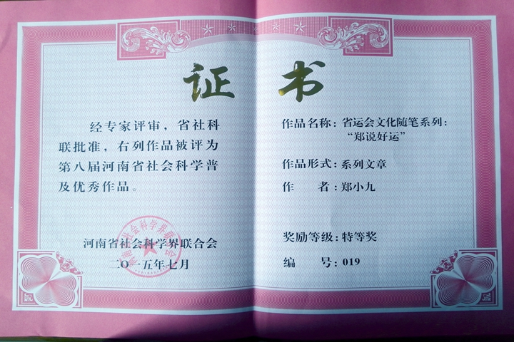 为全方位宣传河南省第十二届运动会暨首届全民健身大会,《焦作日报》于2014年2月推出了河南省第十二届运动会暨首届全民健身大会专刊,并邀请了郑小九教授为省运专刊《郑说好运》专栏撰写文化随笔系列。在7个多月的时间里,郑小九为该专栏写随笔28篇,累计3万余字,代表作品有《河南人中》《修文与修武》《枪之梦》《问君可识“云台月”》《从“移山”到“缝山”》《四海之内皆兄弟》《谁说女子不如男》《小球转动大球》等。系列随笔构思精致,文笔优雅,内涵丰富,贴近焦作历史文化和大众体育生活,堪称省运专刊的“点睛之笔”,是我校以文化优势服务地方社会发展的一项积极成果。