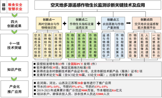 聚焦国际前沿和制约农作物生长监测诊断技术瓶颈,经过10多年攻关,攻克了“农作物遥感精细分类和物候智能提取、作物生长指标定量遥感反演、作物养分水分病虫害监测诊断与产量测报、作物生长精准监测和智能决策系统与大数据平台”等核心关键技术,创建了星机地多源数据融合的作物生长“实时监测-精确诊断-定量调控-智能决策”技术体系。