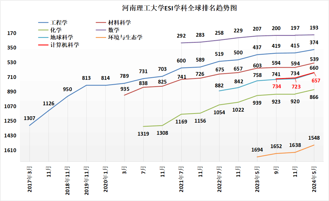 2017年学校工程学首次进入ESI全球排名前1%行列。2020年材料科学、化学2个学科首次进入ESI全球排名前1%行列。数学、地球科学2个学科先后于2021年、2022年首次进入ESI全球排名前1%,环境与生态学、计算机科学2个学科于2023年首次进入ESI全球排名前1%。我校目前有工程学、材料科学、化学、数学、地球科学、环境与生态学、计算机科学等7个学科进入ESI全球排名前1%。工程学学科进入ESI全球排名前1.5‰,材料科学学科进入ESI全球排名前4‰,化学学科进入ESI全球排名前4.5‰。