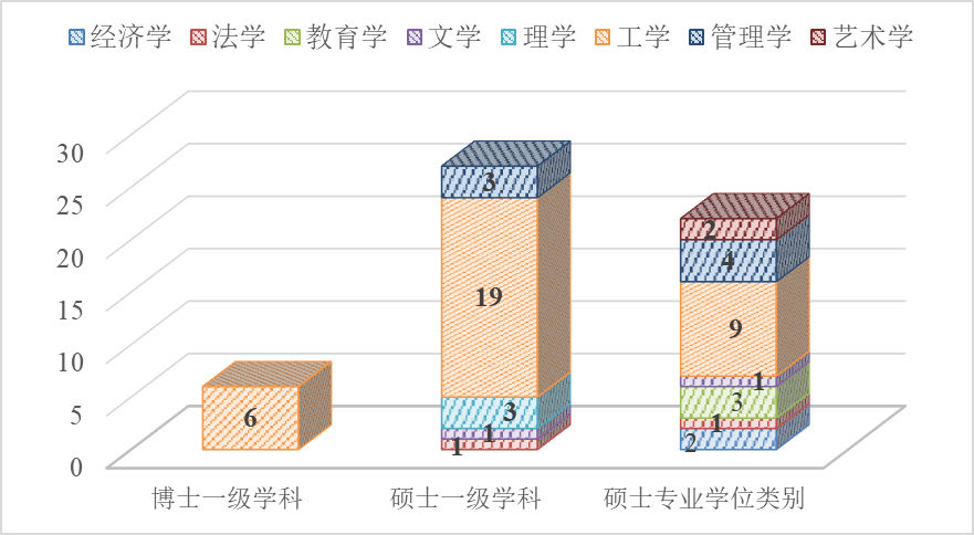 学校坚持以习近平新时代中国特色社会主义思想为指导,深入贯彻落实全国、全省研究生教育会议精神,2021年召开学校研究生教育会议,完善“十四五”规划,发布研究生教育提升行动计划,持续加强学科学位点建设,提升导师队伍水平,完善人才培养体系,推动学位与研究生教育高质量、内涵式发展。截至目前,研究生学位授权点数量达到55个,其中一级学科博士点6个、一级学科硕士点27个、硕士专业学位授权类别22个,学位授权点涵盖了理、工、管、经、法、教、文、艺等8大学科门类,覆盖所有教学学院,学位点布局结构更趋合理。