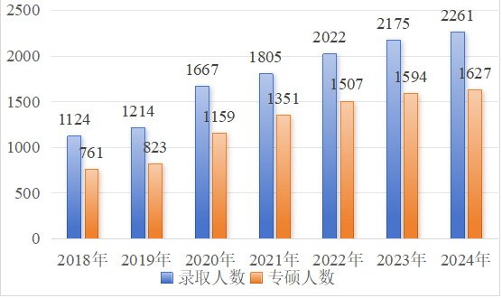 学校研究生招生规模持续扩大。博士研究生招生人数从2018年的56人增加到2024年的91人,增长62.5%;硕士研究生招生人数从2018年的1123人增加到2024年的2261人,增长101.3%。专业学位研究生招生规模快速增长,2024年,专业学位研究生招生人数占硕士研究生招生总人数的72.4%。在校生规模,从2018年的3828人到2024年的6358人,增长了66.1%。
