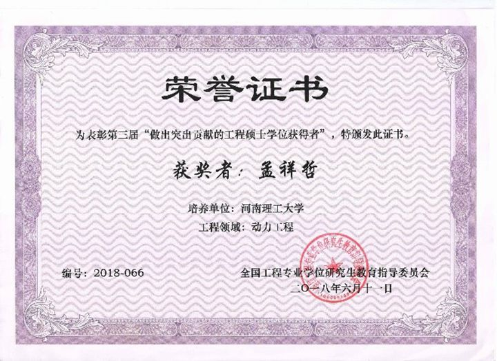 不断完善学位授予管理机制,进一步压实导师和培养学院论文质量保证的主体责任,强化学位授予各环节的监督和指导,推动研究生培养质量分流机制和学术不端零容忍机制,增强论文质量底线意识,保证学位授予与研究生教育质量。2018—2024年授予学位6953人,其中:博士学位238人,硕士学位6715人。2018年以来授予研究生学位数占我校授予研究生学位总量的51.61%。获河南省优秀博士学位论文9篇,河南省优秀硕士学位论文67篇,并评选校级优秀博士学位论文40篇、校级优秀硕士学位论文555篇。获中国煤炭学会优秀博士学位论文提名奖3篇,中国机械工程学会上银优秀博士学位论文2篇,中国职业安全健康协会优秀博士学位论文提名奖1篇,金融专业学位教指委优秀硕士学位论文1篇。1人获工程教指委第三届“做出突出贡献的工程硕士学位获得者”。