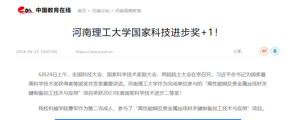 日前,在2023年度国家科学技术奖励大会上,由河南理工大学参与完成的“高性能铜及贵金属丝线材关键制备加工技术与应用”成果荣获国家科学技术进步奖二等奖。连日来,中国科学报、河南日报等媒体进行了报道。相关内容如下: